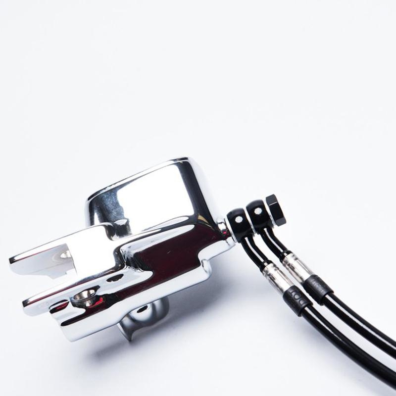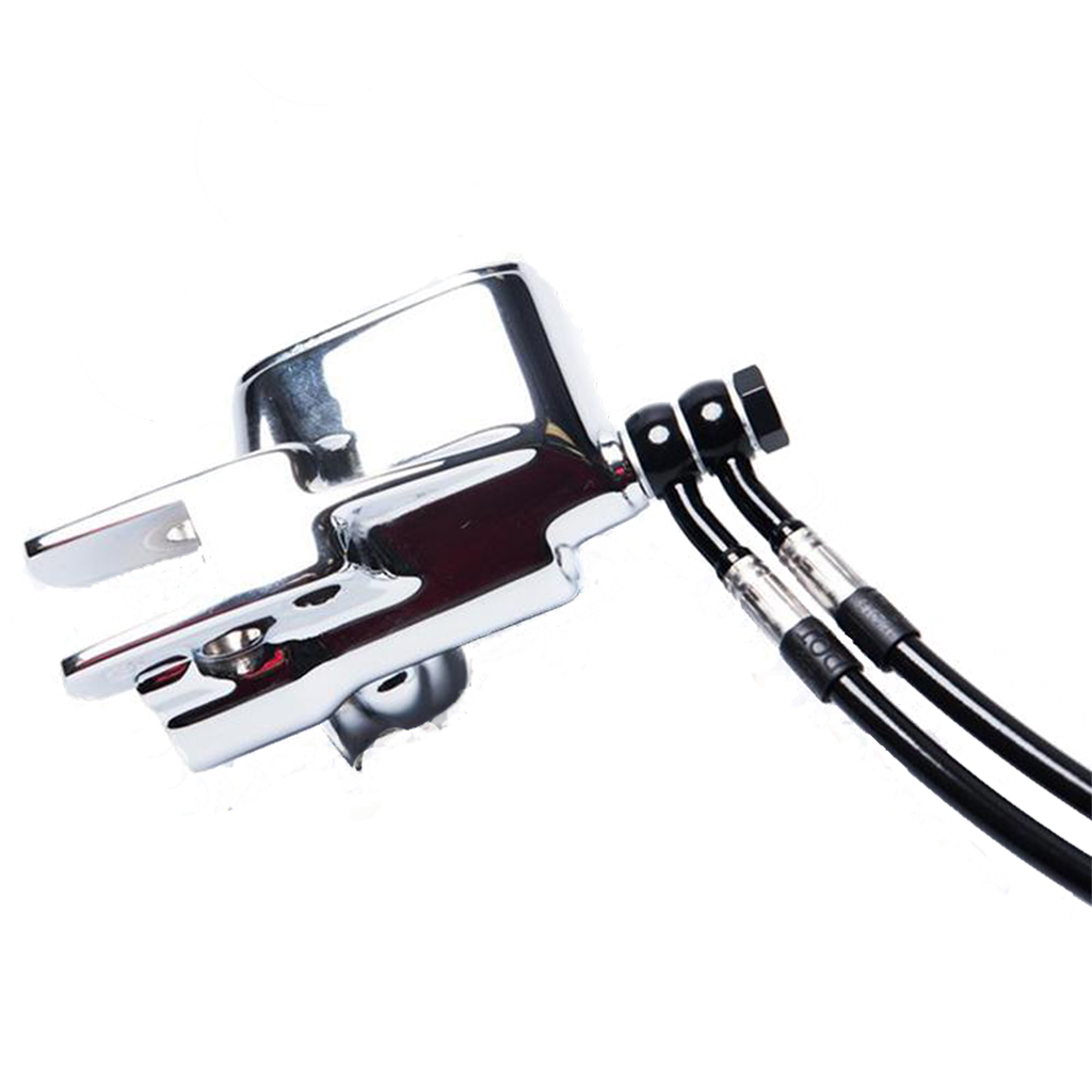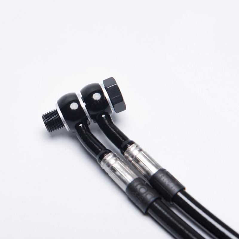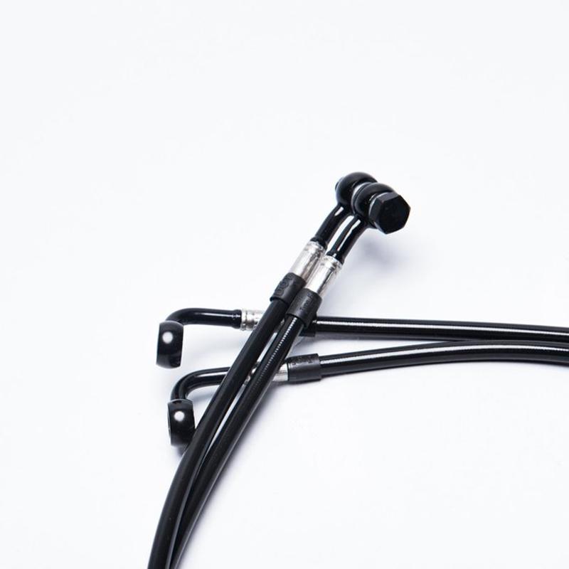 Big Al's Cycles double banjo dual disc brake line kit. Fits all dual disc Dyna and FXR models. Unique design features two lines that tie together at the master cylinder for a better feel at the lever and no need for a bulky metal junction block. Line is Black coated stainless steel with black anodized banjo fittings. Dot approved. Lifetime warranty. Available in 42", 44", 46", and 48"